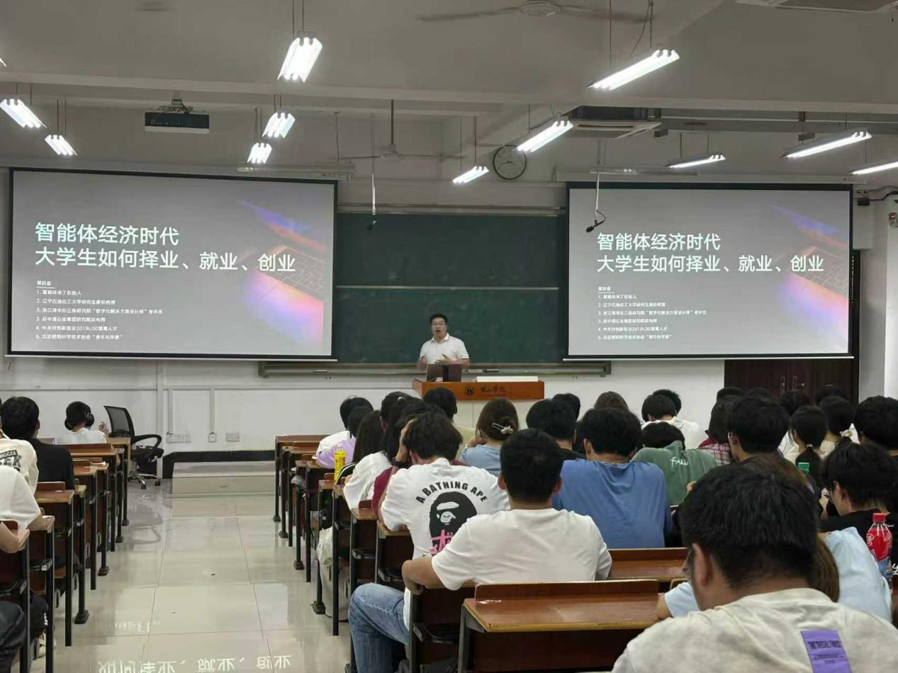 9月24日下午,行知讲坛第225讲在文渊楼1305教室举行。智能体来了公司创始人、辽宁石油化工大学研究生校外兼职教授黎跃春受邀作题为“智能体经济时代大学生如何择业、就业、创业”的专题报告。信息工程学院百余名师生现场聆听,报告由信息工程学院副院长马堃主持。
