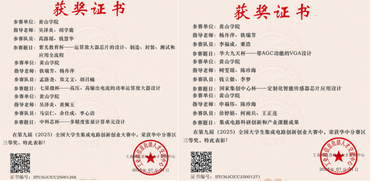 2025年,团队以赛促学、以赛促练,精心组织学生参与各类高水平集成电路领域竞赛,在全国及省级赛场屡创佳绩。在全国大学生集成电路创新创业大赛、安徽省第五届集成电路精英赛、一带一路暨金砖国家技能发展与技术创新大赛集成电路设计与应用赛项等重要赛事中,团队学子凭借扎实的专业基础、出色的创新思维与协作能力脱颖而出。其中,斩获国家级二等奖1项;区域赛层面收获颇丰,拿下一等奖2项、二等奖2项、三等奖10项;省级赛场同样表现亮眼,荣获二等奖2项、三等奖1项,优胜奖若干;特别值得一提的是,成功实现全国大学生集成电路创新创业大赛赛道数突破,填补相关领域赛事成绩空白。一系列奖项的取得,不仅是对学生专业能力的高度认可,更印证了团队“理论+实践”融合育人模式的显著成效。